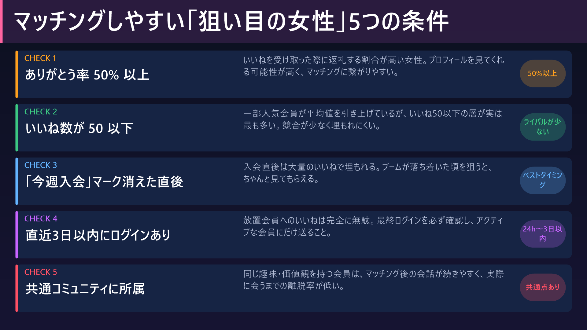 「誰にいいねを送るか」は「どうやっていいねを増やすか」と同じくらい重要な話だ。手当たり次第に人気女性へいいねを送っていると、いいねが枯渇するだけでマッチングにつながらない。ここでは、返ってきやすい女性を見極めるための複数の観点を紹介する。